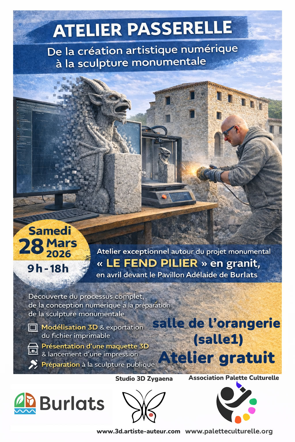 Dans le cadre du programme Atelier Passerelle, développé par l’association Palette Culturelle, nous vous proposons le samedi 28 mars 2026, un atelier exceptionnel autour du projet « Le Fend Pilier », une sculpture en granit qui sera réalisée en public devant le Pavillon Adélaïde de Burlats au mois d’avril.